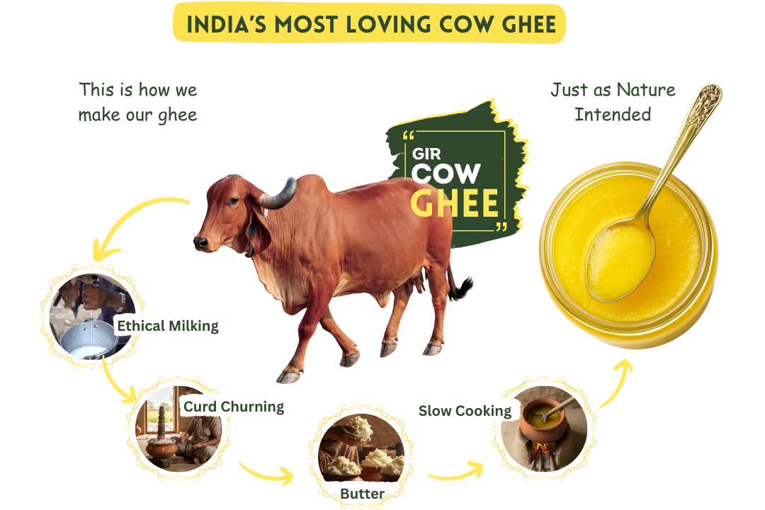 Our ghee is prepared using the traditional Bilona method, where curd is hand-churned and slow-cooked on low heat. Unlike industrial ghee, this process helps retain natural aroma, nutrition, and digestibility. The milk is sourced from freely grazed Gir cows.