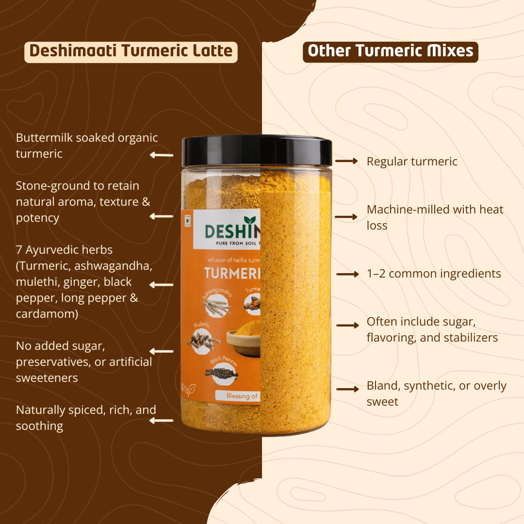DeshiMaati Turmeric Latte is a nourishing blend of 7 carefully selected Ayurvedic herbs — Turmeric, Ashwagandha, Ginger, Mulethi, Long Pepper, Black Pepper, and Cardamom.