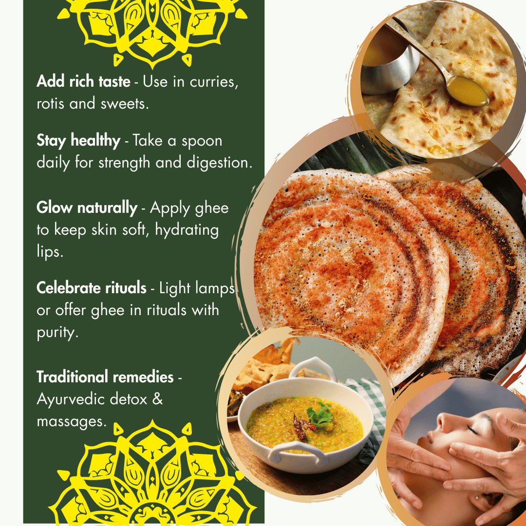 - Slow Heating – Gives rich aroma, golden color, and Ayurvedic benefits.
