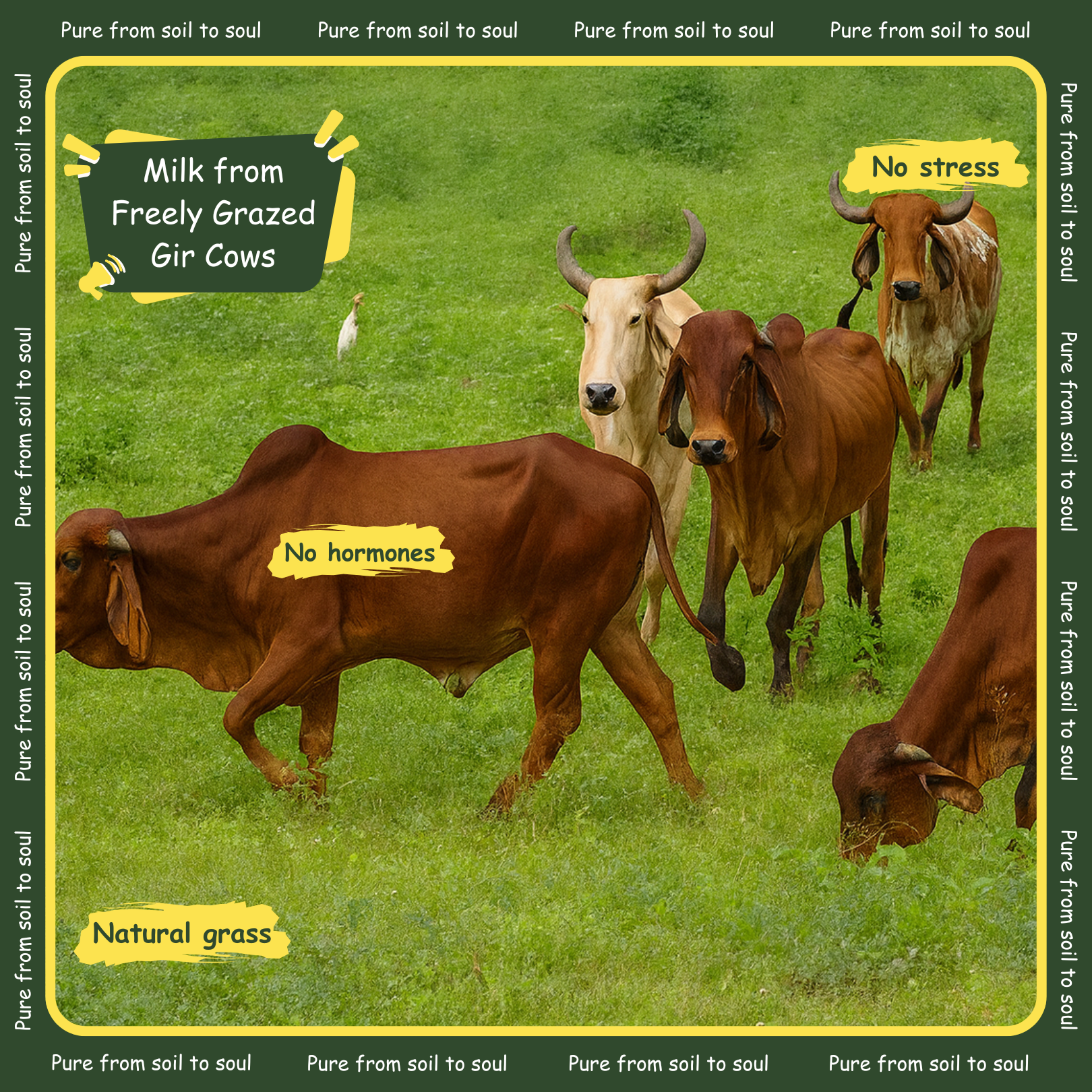 - Free Grazing Gir Cows – Produce clean, nutrient-rich A2 milk.