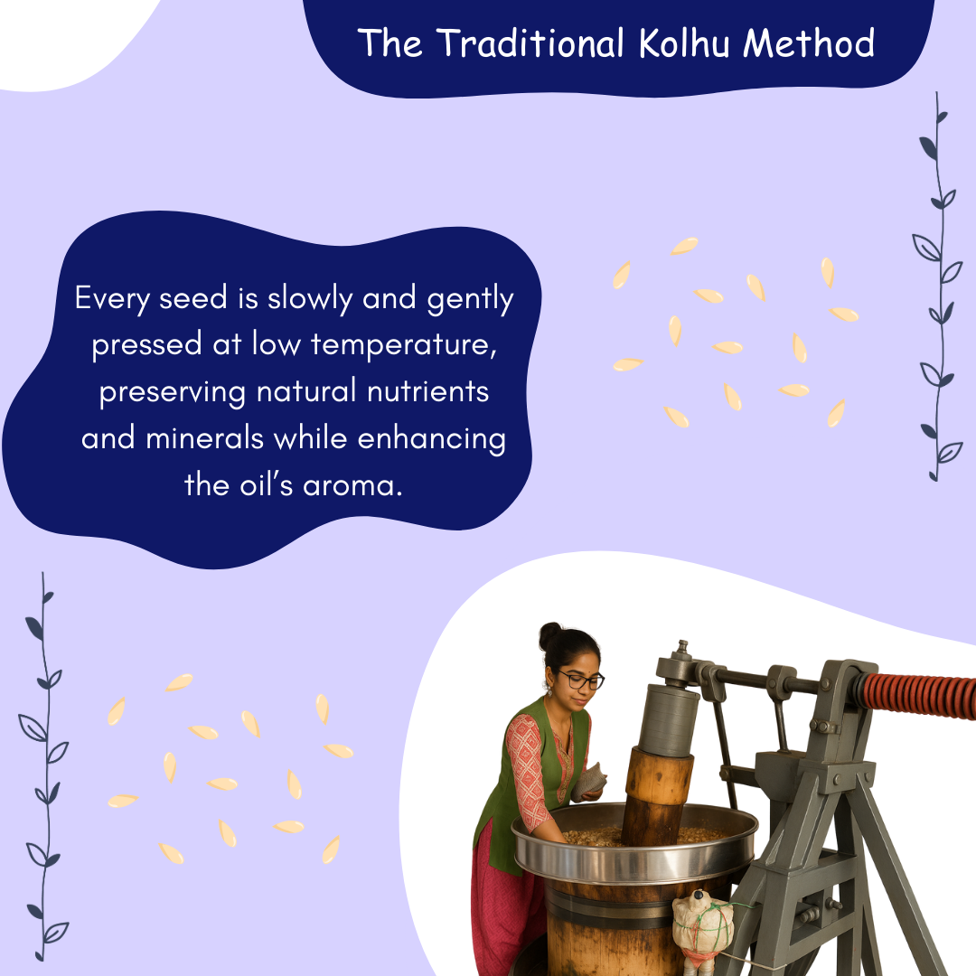Slow crushing in a wooden kolhu prevents nutrient loss and protects heat-sensitive compounds like sesamin and sesamol.
