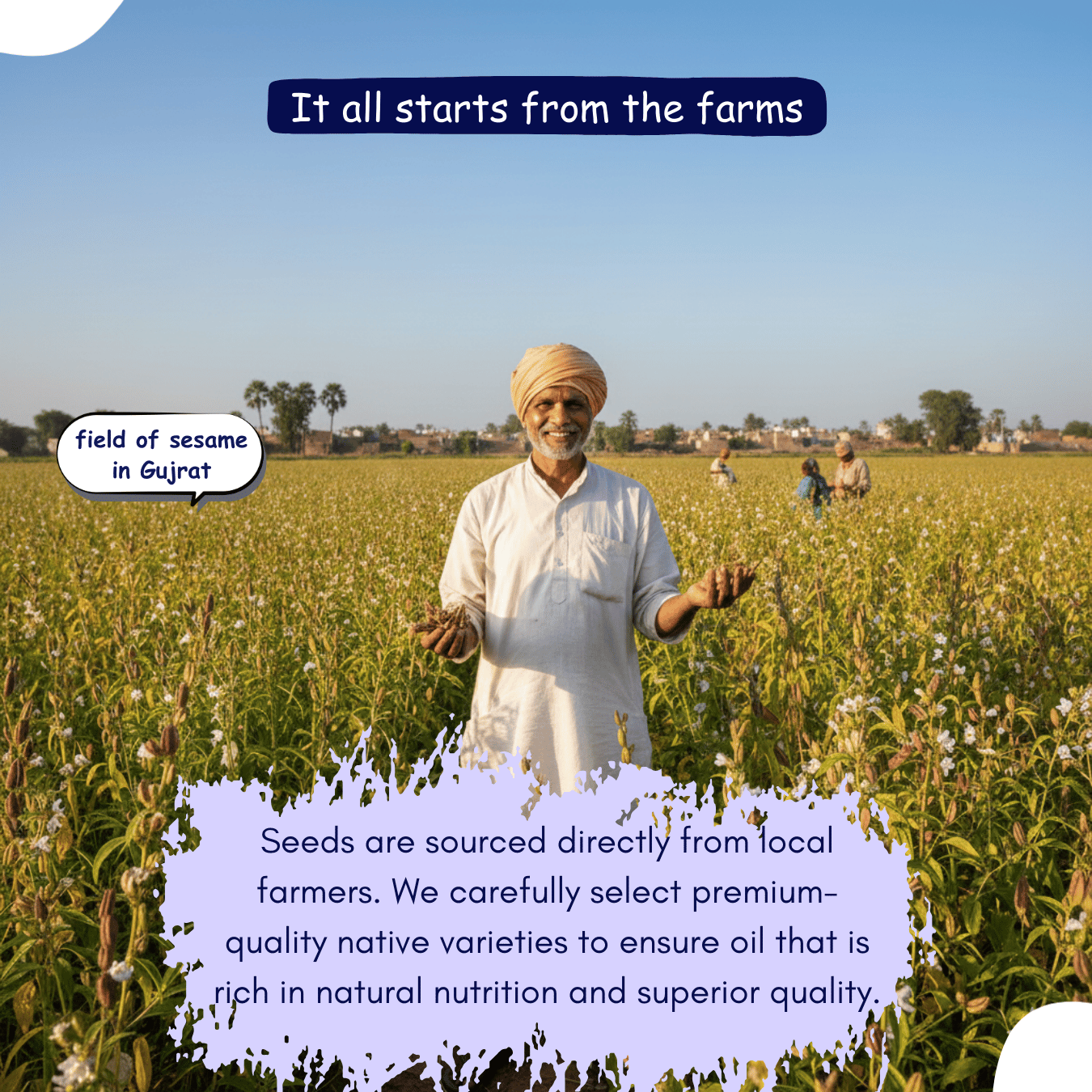 We source high-quality sesame seeds and extract oil in small batches, ensuring freshness, purity, and consistency. Each bottle reflects our commitment to: